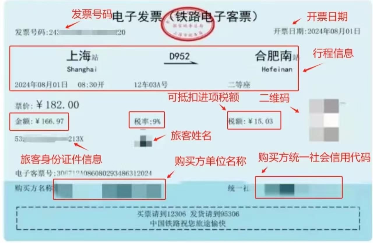 数电票的电子发票(铁路电子客票)票面信息更加丰富,除了乘车人相关信息外,还新增了增值税信息和报销单位信息。